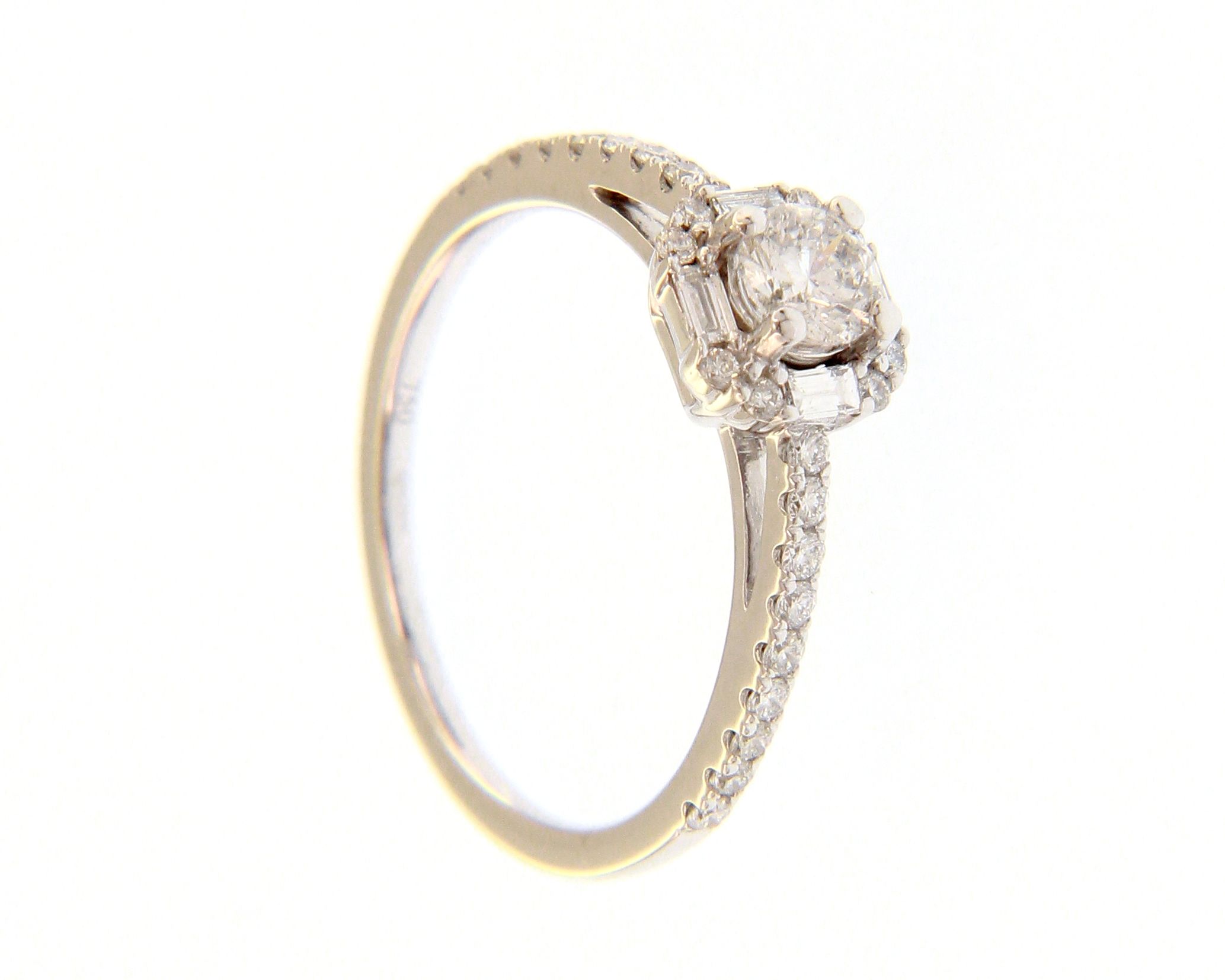 Anillo solitario de compromiso de oro blanco de 18K con diamante central y pavè de diamantes.